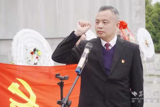 上午10時30分,百余黃石退役軍人代表們在烈士紀(jì)念碑前,全體默哀一分鐘,向革命先烈敬獻(xiàn)花籃、花圈,瞻仰烈士紀(jì)念群雕,深切悼念革命英烈。面對鮮紅的黨旗,黨員代表們右手握拳,重溫入黨誓詞,鏗鏘有力的誓言響徹革命烈士陵園。