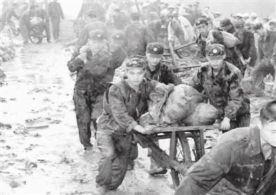 1998年7月,為確保荊江大堤的安全,數(shù)千名解放軍官兵以驚人的毅力堅(jiān)守在大堤上,排除決堤險(xiǎn)情。圖為戰(zhàn)士們運(yùn)送袋裝沙石加固大堤。新華社記者 李 剛攝