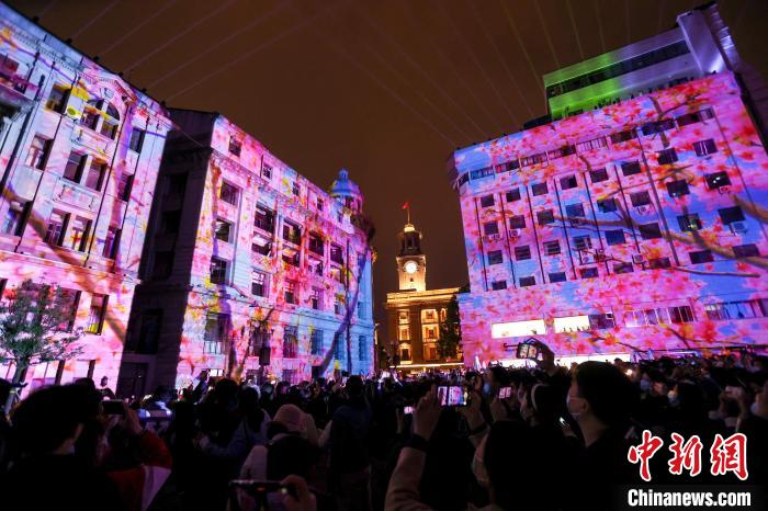 3月23日晚,武漢市江漢路步行街上演櫻花主題燈光秀 張暢 攝