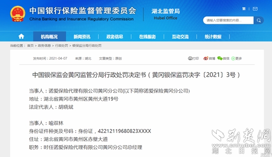 荊楚網(wǎng)(湖北日?qǐng)?bào)網(wǎng))訊(記者阮瓊)4月7日,中國(guó)銀保監(jiān)會(huì)黃岡監(jiān)管分局發(fā)布行政處罰決定書,對(duì)諾愛保險(xiǎn)代理有限公司黃岡分公司(以下簡(jiǎn)稱諾愛保險(xiǎn)代理黃岡分公司)以及該公司總經(jīng)理喻雙林分別給予警告,并罰款5000元的行政處罰決定。