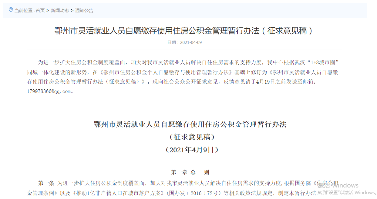 《鄂州市靈活就業(yè)人員自愿繳存使用住房公積金管理暫行辦法(征求意見稿)》。網(wǎng)頁截圖