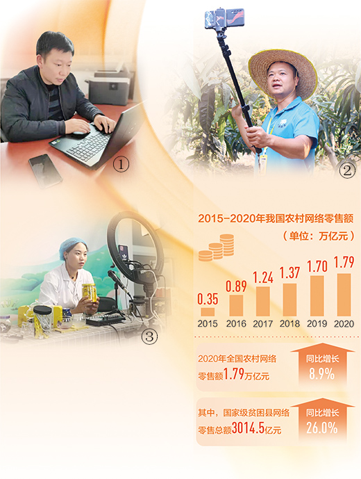 近年來,我國農(nóng)村網(wǎng)絡(luò)零售額增長迅速,田江海、羅東等鄉(xiāng)村電商人才,成長為幫助農(nóng)民增收致富的帶頭人。2020年,全國農(nóng)村網(wǎng)絡(luò)零售額1.79萬億元,其中,全國832個國家級貧困縣網(wǎng)絡(luò)零售總額達(dá)3014.5億元。
