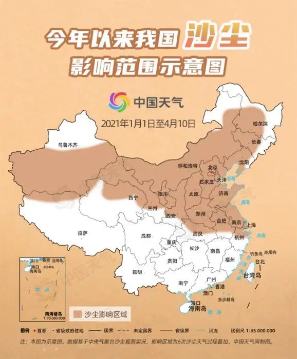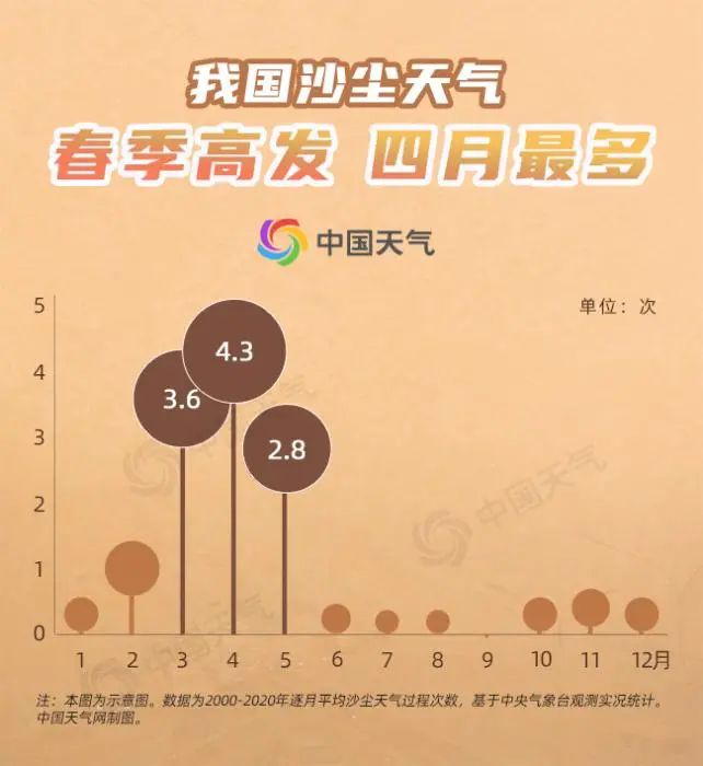 來自中央氣象臺的數(shù)據(jù)顯示,我國沙塵天氣的高發(fā)期主要集中3-5月份,幾乎占到了全年的80%。而這三個月中,又屬4月的沙塵天氣過程最多,平均能達到4.3次。