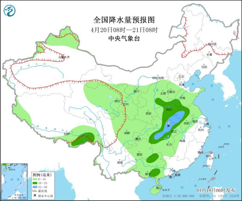 4月20日08時至21日08時,新疆北部、西北地區(qū)中部、西藏南部等地的部分地區(qū)有小到中雪或雨夾雪;西北地區(qū)東部、華北南部和西部、黃淮、江淮大部、江漢、江南北部和西部、西南地區(qū)東部、華南西部等地的部分地區(qū)有小到中雨,其中,河南南部、安徽北部、湖北中部、湖南西北部等地局地有大雨(25~45毫米)(見圖3)。