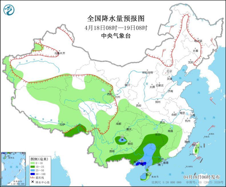 4月18日08時至19日08時,新疆西部、西北地區(qū)中部、西藏東部和南部等地的部分地區(qū)有小到中雪或雨夾雪,局地有大雪;江南西南部、華南中西部、云南東南部、貴州西部、西藏東南部等地的部分地區(qū)有中到大雨,其中,廣西南部局地有暴雨(50~90毫米)。內(nèi)蒙古中東部、黑龍江東南部等地的部分地區(qū)有4~5級風(見圖1)。