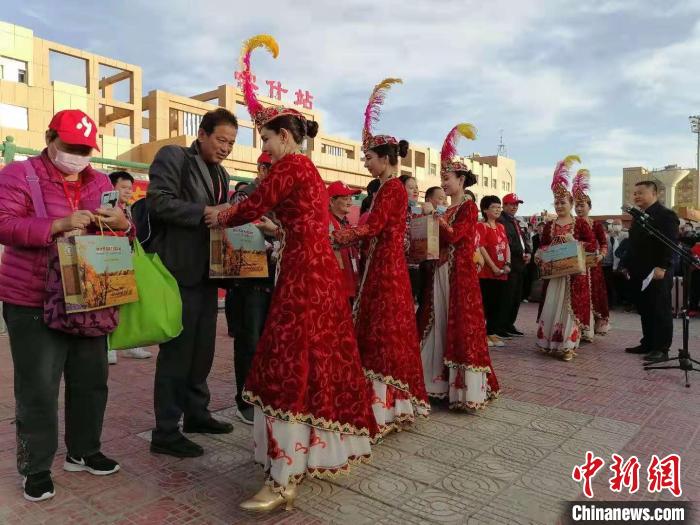 當(dāng)日,在喀什火車站,喀什官方以熱情的歌舞向游客表達(dá)了歡迎,并向游客代表獻(xiàn)上了禮物。