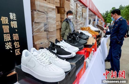 4月23日,湖北咸寧,展示的各類侵權(quán)假冒偽劣商品等待集中銷毀。當(dāng)日,全國打擊侵權(quán)假冒工作領(lǐng)導(dǎo)小組辦公室組織開展16?。▍^(qū)、市)侵權(quán)假冒偽劣商品統(tǒng)一銷毀行動,主會場設(shè)在湖北省咸寧市。據(jù)統(tǒng)計,16?。▍^(qū)、市)統(tǒng)一銷毀侵權(quán)假冒偽劣商品逾30大類、200多個品種、重量近2000噸,貨值達(dá)7億余元。中新社記者 張暢 攝