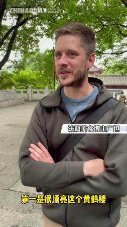 一下高鐵,媒體團采訪的第一站就來到雄踞長江之濱、蛇山之上的黃鶴樓。在這里,我們遇到了三個人:帶著82歲高齡母親特地來看黃鶴樓的張女士,想嘗嘗正宗熱干面的法籍美食博主戴廣坦,和向世界推介武漢的黃鶴樓工作人員。對他們的采訪時間不長,但寥寥幾句對話,就已經道出他們與武漢的感情。