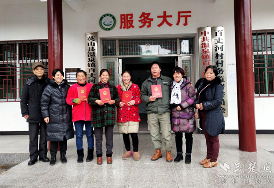 溫泉鎮(zhèn)百丈河村首批不動產(chǎn)權(quán)證發(fā)放到戶,村民喜笑顏開。通訊員供圖