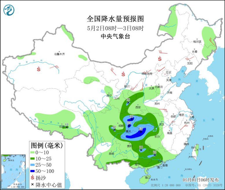 5月2日8時至3日8時,西北地區(qū)東部、江漢西部、江南西北部、西南地區(qū)東部、華南中西部等地的部分地區(qū)有中到大雨,其中,湖南西北部、四川盆地東部、貴州北部等地的部分地區(qū)有暴雨(50~65毫米)。內(nèi)蒙古中西部、西北地區(qū)東北部、東北地區(qū)南部、黃淮西部、江南東北部等地的部分地區(qū)有4~6級風(fēng)。內(nèi)蒙古中西部、新疆南疆盆地等地的部分地區(qū)有揚沙或浮塵天氣,局地有沙塵暴。