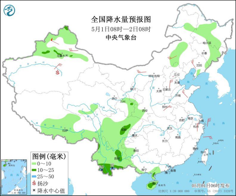 5月1日8時至2日8時,新疆北部高海拔地區(qū)和西藏中東部等地的部分地區(qū)有小到中雪或雨夾雪,其中,新疆北疆阿勒泰局地有大雪;東北地區(qū)東部和北部、內(nèi)蒙古東部、四川大部、云南大部、貴州西部、華南西南部、海南島等地的部分地區(qū)有小到中雨,其中,云南南部等地局地有大雨(25~40毫米)。新疆北部和南疆盆地、內(nèi)蒙古、華北北部等地的部分地區(qū)有5~7級風(fēng),其中,新疆山口地區(qū)風(fēng)力可達(dá)11~12級。新疆北疆東部和南疆盆地等地的部分地區(qū)有揚沙或浮塵天氣,局地有沙塵暴。