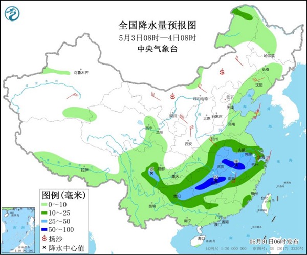5月3日,黃淮西部、江淮大部、江漢東部、江南西部和北部、四川盆地西南部、貴州大部、華南西北部等地的部分地區(qū)有中到大雨,其中,安徽西南部、湖北東部、湖南中北部、江西北部等地的部分地區(qū)有暴雨(50~90毫米)。