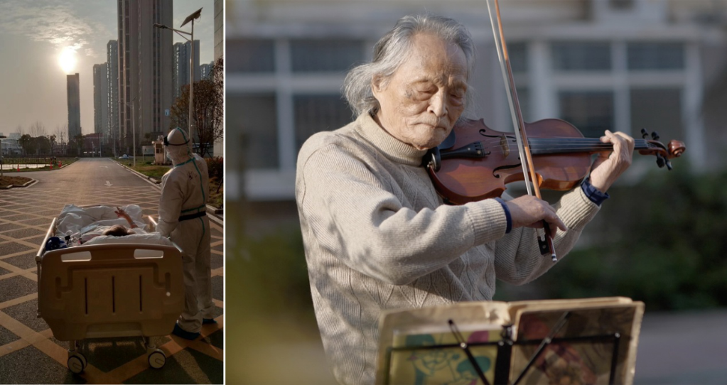這是一張拼版照片,左圖為:2020年3月5日傍晚,在湖北省武漢大學(xué)人民醫(yī)院東院,復(fù)旦大學(xué)附屬中山醫(yī)院支援湖北醫(yī)療隊(duì)醫(yī)生在護(hù)送患者王欣做CT的途中停下,讓住院近一個(gè)月的老人欣賞久違的日落(甘俊超 攝);右圖為:3月24日,“看夕陽的老人”王欣在東西湖區(qū)園藝花城小區(qū)內(nèi)拉小提琴(新華社記者熊琦攝)。
