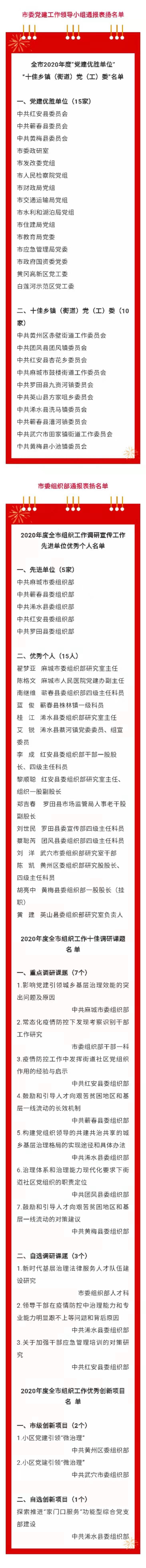 會議對2020年度“黨建優(yōu)勝單位”“十佳鄉(xiāng)鎮(zhèn)(街道)黨(工)委”“全市組織工作調研宣傳工作先進單位和優(yōu)秀個人”“全市組織工作十佳調研課題”“全市組織工作優(yōu)秀創(chuàng)新項目”“全市離退休干部先進集體和先進個人”進行了通報表揚,并授予部分基層黨組織“全市離退休干部示范黨支部”稱號。此次有170個單位獲表彰,其中黨建優(yōu)勝單位15家。