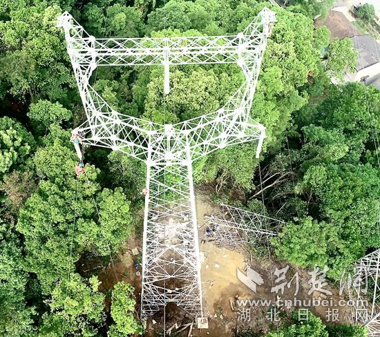 “這個(gè)季節(jié),山上的樹木瘋長,容易造成與線路的安全距離不夠的問題,很可能影響電力線路的可靠運(yùn)行?!痹摴粳F(xiàn)場負(fù)責(zé)人徐濤介紹,通過前期勘察設(shè)計(jì),黃石供電決定在220千伏黃港線一回線路樹障嚴(yán)重的8號(hào)和9號(hào)鐵塔處,拆除原有鐵塔,組立更高的鐵塔,讓樹枝不再輕易“夠”到線,電能也可安全暢通流過。同時(shí),為確保220千伏黃港線二回線路中間段弧垂低的問題,還在該線路中間新立了一基礎(chǔ)70米的鐵塔。