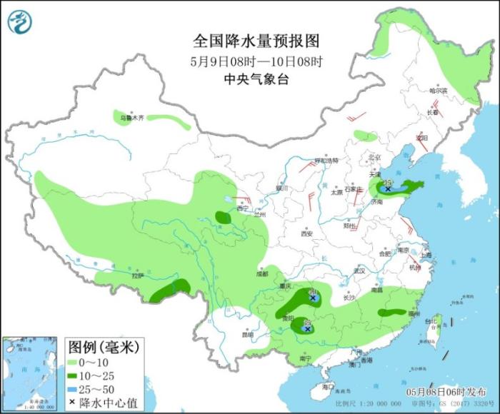 全國(guó)降水量預(yù)報(bào)圖(5月8日8時(shí)-9日8時(shí))