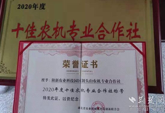 精心服務(wù)農(nóng)業(yè),4月份,合作社從湖北省農(nóng)業(yè)機(jī)械化科技創(chuàng)新聯(lián)合會(huì)捧回了湖北省“十佳農(nóng)機(jī)專業(yè)合作社”的獎(jiǎng)牌和榮譽(yù)證書。