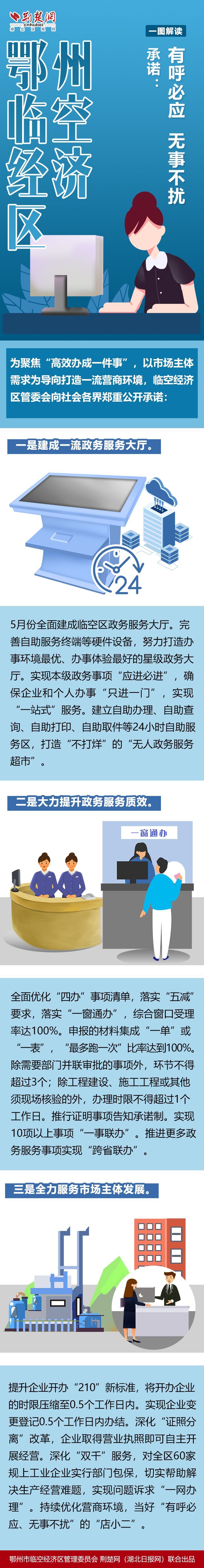 荊楚網(wǎng)(湖北日報網(wǎng))訊(記者劉璐 通訊員王濤、熊聰)5月10日,鄂州市臨空經(jīng)濟區(qū)管委會發(fā)布營商環(huán)境公開承諾書,從“建成一流政務(wù)服務(wù)大廳”“大力提升政務(wù)服務(wù)質(zhì)效”“全力服務(wù)市場主體發(fā)展”3方面進行公開承諾,全面優(yōu)化“四辦”事項清單,落實“五減”要求,落實“一窗通辦”,綜合窗口受理率達100%。具體那些承諾?下面小編帶您“圖”個明白。