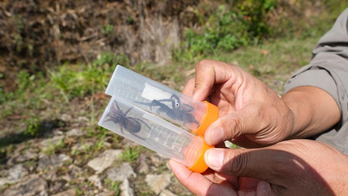 科考人員展示捕鳥蛛。(臨滄融媒體新聞社供圖)