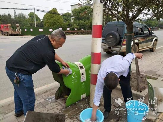 原來,針對群眾反映“鎮(zhèn)區(qū)107國道沿線垃圾桶臟亂不堪”問題,賀勝鎮(zhèn)機關(guān)40名黨員實名認(rèn)領(lǐng)垃圾桶,在垃圾桶貼上自己的名字及聯(lián)系電話,并負(fù)責(zé)垃圾桶的清潔和周邊衛(wèi)生,還把擦得蹭光瓦亮的垃圾桶曬群里比賽。這樣既增強了黨員為民服務(wù)的意識,群眾也深受感染,垃圾分類入桶的自覺性提高了。