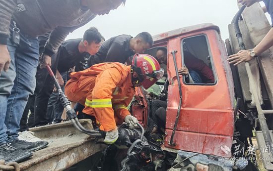 消防人員在現(xiàn)場發(fā)現(xiàn),一輛運石材的貨車因雨天剎車失靈與前車相撞,玻璃碎片、零部件散落一地,后車司機(jī)受傷流血、左腿骨拆,被卡在駕駛室內(nèi)不停呻吟。消防員立即對所在道路進(jìn)行警戒、封路,隨后指揮員下令,采用搶險救援車作為牽引車輛,把駕駛室空間擴(kuò)張開,給其他救援人員打開空間方便救援。經(jīng)過十分鐘的緊張救援,被困司機(jī)成功獲救,并被轉(zhuǎn)交現(xiàn)場的120急救人員。
