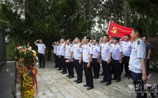 在宛希先、宛希儼革命烈士紀(jì)念碑前,黃梅縣稅務(wù)局黨委委員、副局長(zhǎng)胡勇,縣稅務(wù)局黨委委員、副局長(zhǎng)貢文彬,仔細(xì)整理花籃緞帶。全體黨員面向紀(jì)念碑肅立,向宛希先、宛希儼烈士和已故革命先輩默哀致敬,并在鮮紅的黨旗下,舉起右手,重溫入黨誓詞。