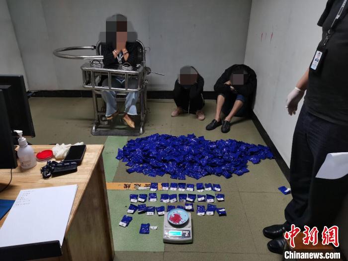 圖為民警抓獲的三名犯罪嫌疑人及繳獲的冰毒?!〉潞赀吘彻芾碇ш?duì)供圖
