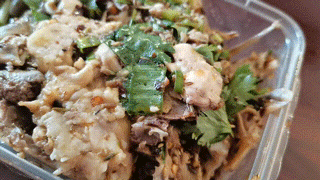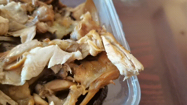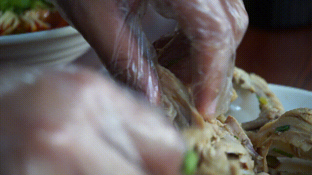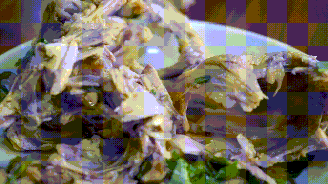 用雞湯熬煮出的雞架,聞起來香而不膩,搭配上榨菜末、香菜末再來點辣椒油,完美!吃之前,必須要有一個簡單而又復雜的過程,那就是拆雞架。