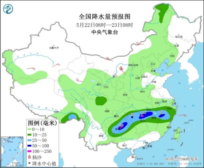 5月22日08時至23日08時,貴州東南部、重慶東南部、湖南北部、湖北東南部、江西北部、安徽西南部、福建西北部、浙江西南部及西藏東南部等地部分地區(qū)有大到暴雨,其中,貴州東南部、湖南東北部等地局地有大暴雨(100~130毫米)。新疆南疆盆地、青海北部、內(nèi)蒙古中西部等地的部分地區(qū)有5~7級風。