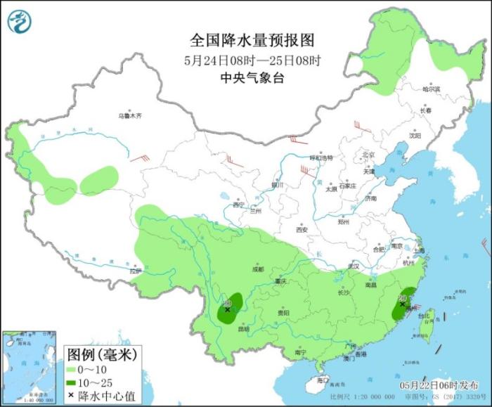 5月24日08時至25日08時,內(nèi)蒙古東部、黑龍江北部、西藏東部、青海南部、江南大部、西南地區(qū)、華南、臺灣島等地部分地區(qū)有小雨,其中,福建東部、四川南部、云南北部等地部分地區(qū)有中雨(10~20毫米)。內(nèi)蒙古大部、新疆南疆盆地等地部分地區(qū)有4~6級風。