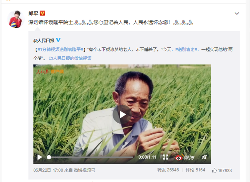 袁隆平逝世以后,不少體壇名宿和運動員表達了哀思。他最喜歡的郎平指導22日晚上在微博上寫道:深切緬懷袁隆平院士。您心里記著人民,人民永遠懷念您。乒乓球奧運冠軍鄧亞萍寫道:送別袁老,您一路走好。游泳名將傅園慧也在微博上寫道:謝謝袁爺爺讓我們都能吃飽飯,爺爺走好。自由搏擊女將張偉麗則用國士無雙來評價袁隆平院士。