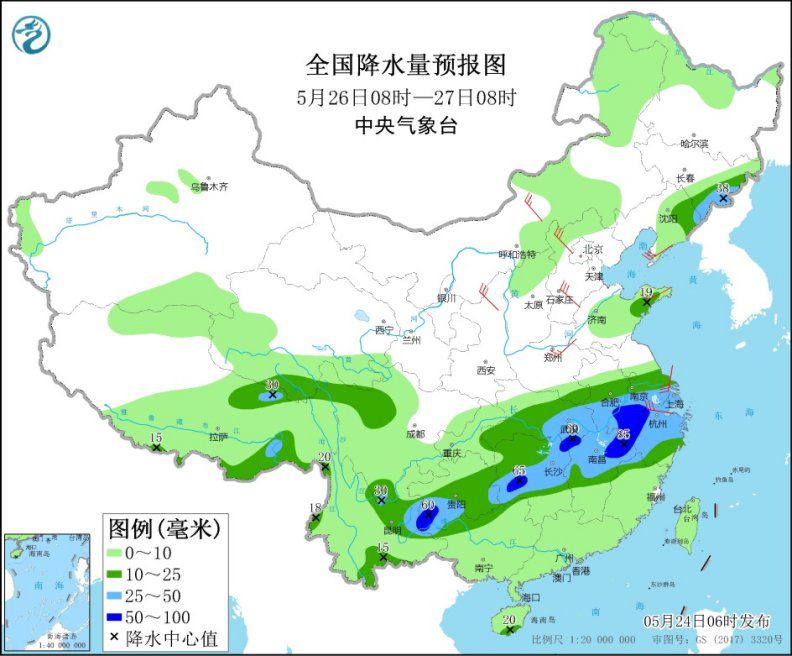 5月26日08時(shí)至27日08時(shí),江淮大部、江漢大部、江南大部、西南地區(qū)東南部、川西高原北部、廣西西北部、東北地區(qū)東南部等地的部分地區(qū)有中到大雨,其中,安徽南部、江西北部、浙江西部、湖北東南部、湖南西部、貴州西南部等地的部分地區(qū)有暴雨(50~85毫米)。西北地區(qū)東北部、內(nèi)蒙古中東部、華北、黃淮、江南東部沿海等地的部分地區(qū)有4~6級(jí)風(fēng)。