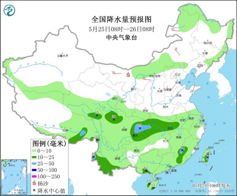 5月24日08時(shí)至25日08時(shí),江南大部、華南、西南地區(qū)大部、東北地區(qū)東部和北部、內(nèi)蒙古東北部等地有小到中雨,其中,福建東部、廣東西部、云南西部和南部、海南島西部、臺(tái)灣島東部等地的部分地區(qū)有大雨,局地暴雨(50~65毫米)。內(nèi)蒙古中東部、西北地區(qū)東北部、華北、黃淮、東北地區(qū)中南部等地的部分地區(qū)有4~6級(jí)風(fēng),其中,內(nèi)蒙古中部、山西北部、河北北部等地的部分地區(qū)陣風(fēng)可達(dá)8級(jí)以上。