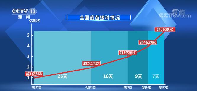 從3月27日接種量超過1億劑次,到4月21日超過2億劑次,這個增加的1億劑次用了25天;5月7日超過3億劑次用了16天;到5月16日超過4億劑次用了9天;而到了昨天(5月24日),這個數(shù)字超過5億劑次用了7天。疫苗接種的速度越來越快。