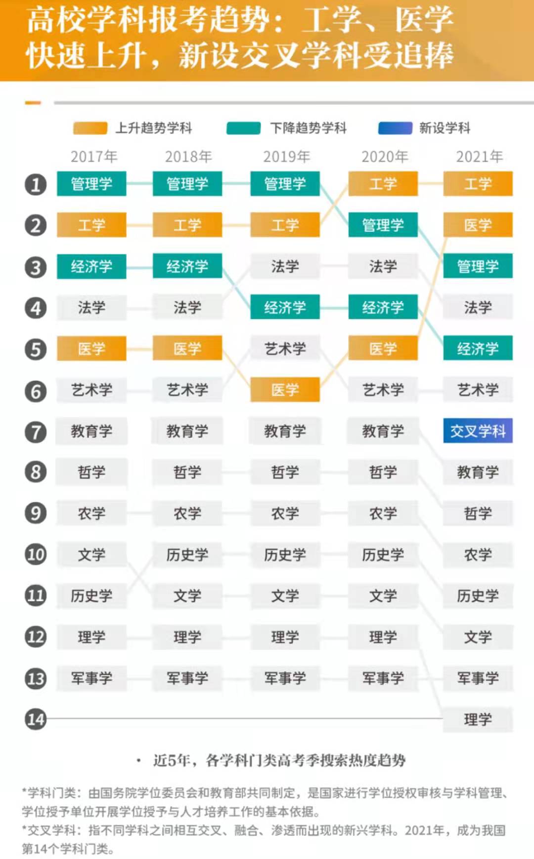 回溯近五年的學(xué)科報(bào)考趨勢(shì),數(shù)據(jù)顯示,工學(xué)、醫(yī)學(xué)的熱度近年提升明顯,而今年剛被列為一級(jí)學(xué)科門(mén)類(lèi)的交叉學(xué)科已經(jīng)人氣十足——人工智能、機(jī)器人等新興專(zhuān)業(yè),被部分院校納入到交叉學(xué)科中培養(yǎng)。而管理學(xué)、經(jīng)濟(jì)學(xué)等學(xué)科門(mén)類(lèi),其熱度在近兩年有一定幅度的下滑。