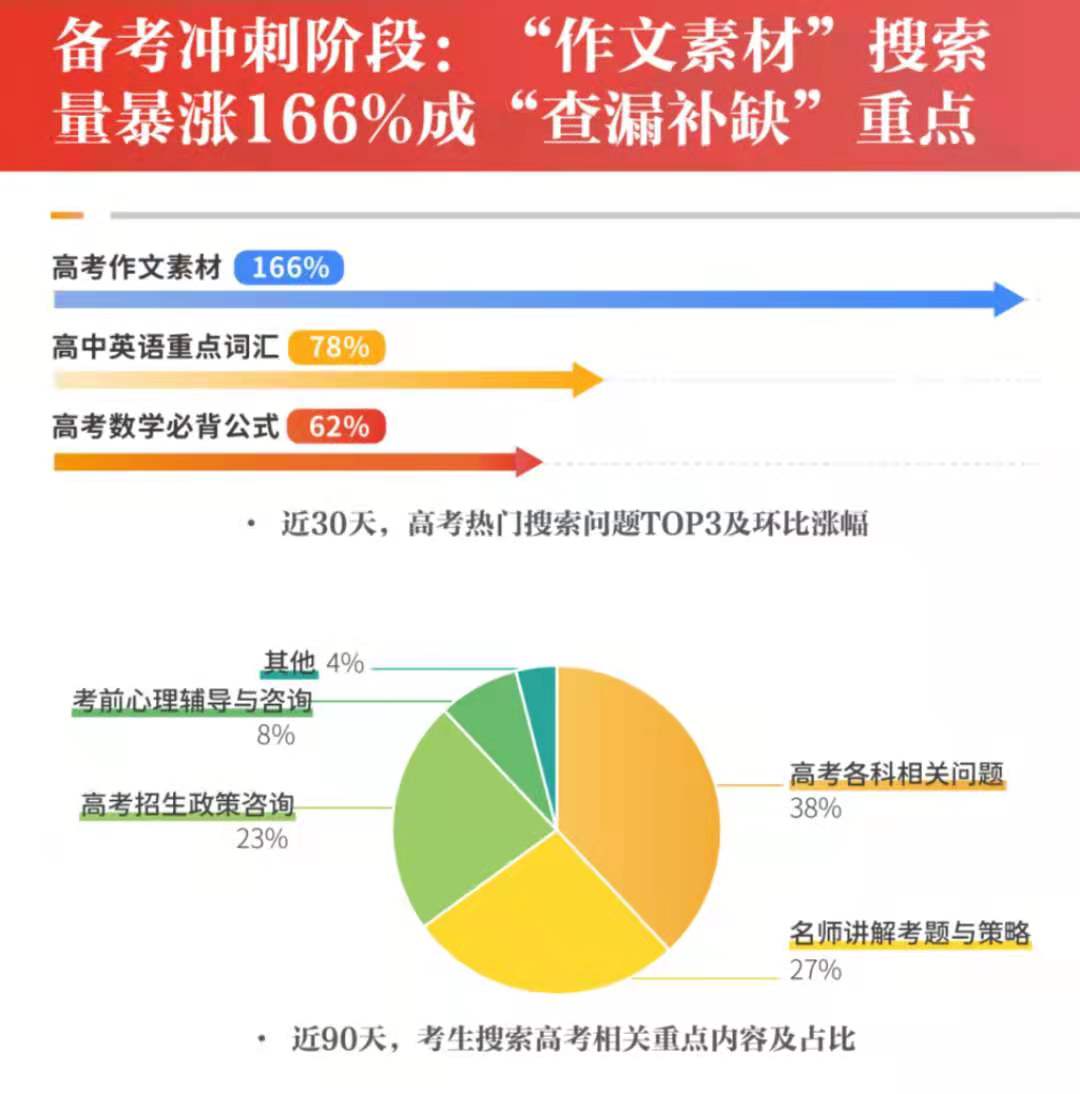 距離2021年高考還有12天,“高考作文素材”“高中英語(yǔ)重點(diǎn)詞匯”與“高考數(shù)學(xué)必背公式”的搜索熱度同比激增,成為今年考生備考熱門(mén)搜索問(wèn)題的前三名。