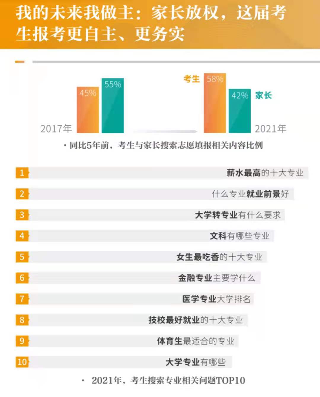 與往年相比,本屆考生的報(bào)考自主性正在加強(qiáng)。同比2017年,考生用戶(hù)對(duì)志愿填報(bào)相關(guān)內(nèi)容的搜索占比提升明顯,已超過(guò)家長(zhǎng)用戶(hù)。這意味著未來(lái)規(guī)劃更多要由考生負(fù)責(zé)。數(shù)據(jù)顯示,考生在搜索專(zhuān)業(yè)相關(guān)問(wèn)題時(shí),薪水、前景以及大學(xué)轉(zhuǎn)專(zhuān)業(yè)的政策要求,都成為他們關(guān)心的重點(diǎn),這屆“00后”考生對(duì)于報(bào)考的考慮非常務(wù)實(shí)。