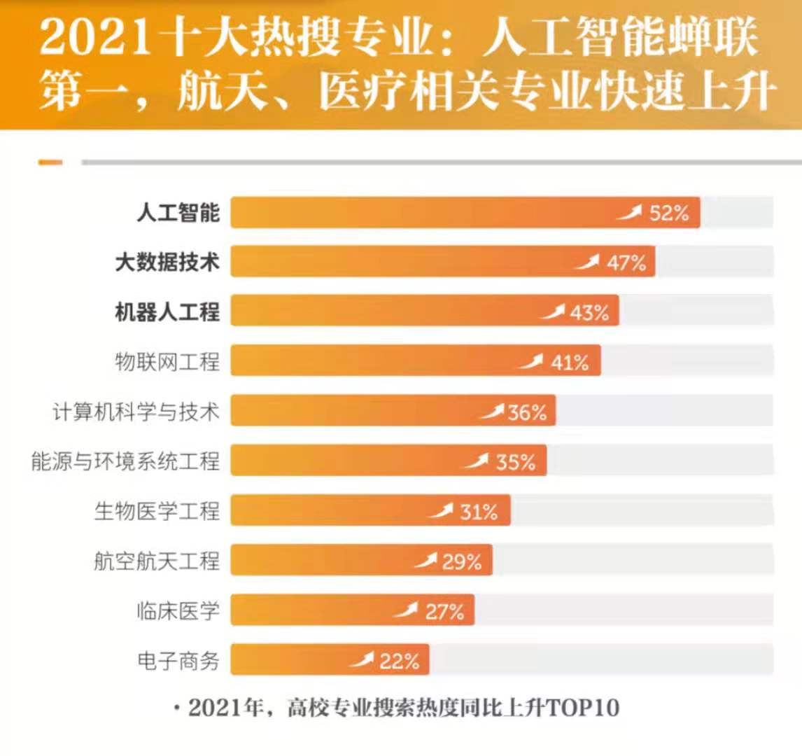 此次發(fā)布的數(shù)據(jù)匯總了2021年以來(lái)搜索熱度增長(zhǎng)最快的十大熱搜專(zhuān)業(yè)——人工智能蟬聯(lián)第一,大數(shù)據(jù)技術(shù)與機(jī)器人工程入榜前三。總體來(lái)看,新工科及交叉學(xué)科持續(xù)受熱捧,越來(lái)越多的考生將未來(lái)職業(yè)規(guī)劃鎖定在了高新產(chǎn)業(yè)當(dāng)中。