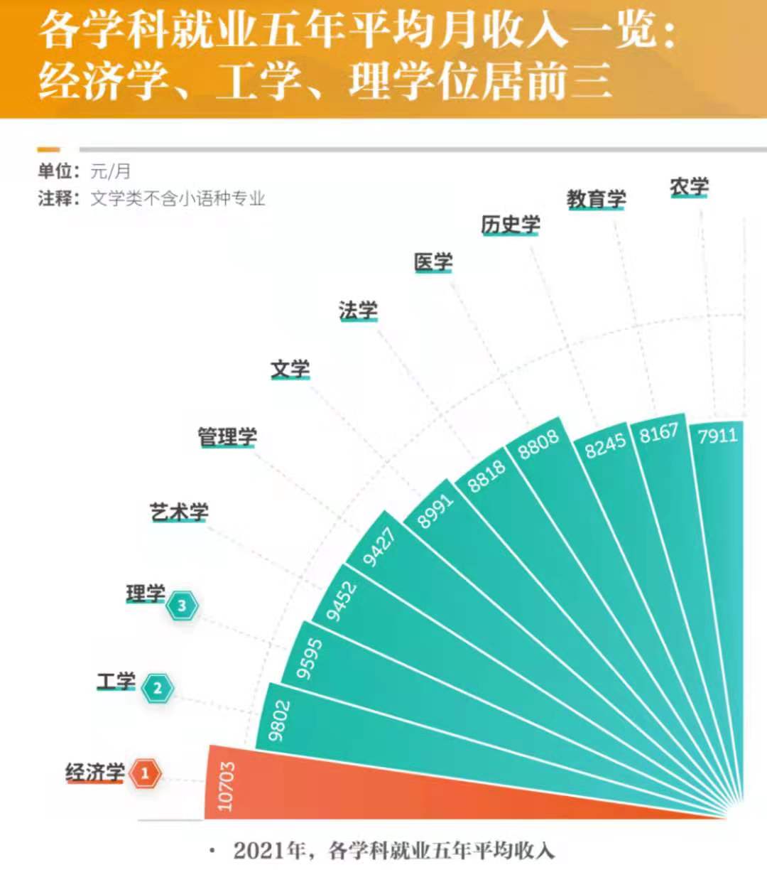 數(shù)據(jù)還統(tǒng)計(jì)了各學(xué)科畢業(yè)生就業(yè)五年后的平均月收入水平,經(jīng)濟(jì)學(xué)各專(zhuān)業(yè)畢業(yè)生以平均每月10703元的收入位列第一,工學(xué)和理學(xué)專(zhuān)業(yè)緊隨其后。
