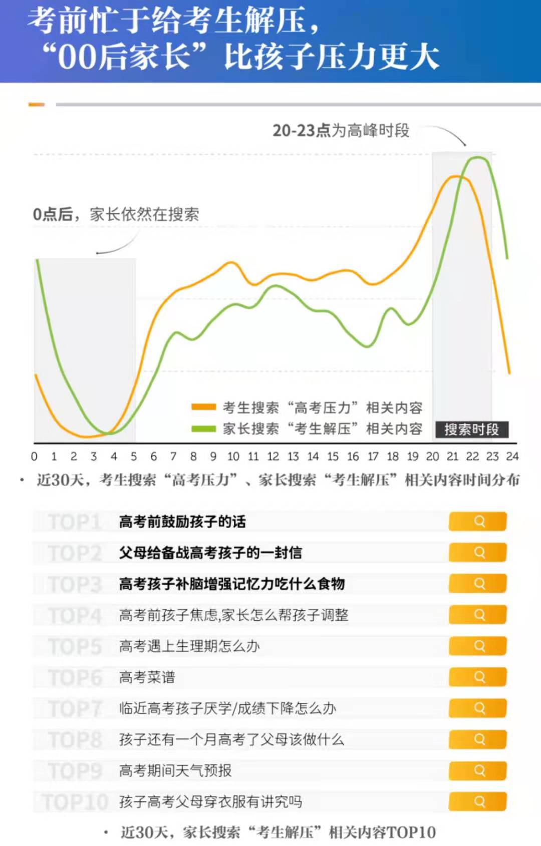 面對(duì)考生的情緒波動(dòng),家長(zhǎng)可能更加著急。數(shù)據(jù)顯示,考生搜索“高考?jí)毫Α迸c家長(zhǎng)搜索“高考解壓”的時(shí)間分布多集中在夜晚,但孩子陸續(xù)入睡后,家長(zhǎng)用戶(hù)依然保持著較高的搜索活躍度:如何鼓勵(lì)孩子?如何幫助孩子調(diào)整焦慮?如何做好飲食等后勤保障?一連串熱搜問(wèn)題的背后,是父母的無(wú)聲努力。一人高考,全家備戰(zhàn),每一位考生都不是單兵作戰(zhàn)。