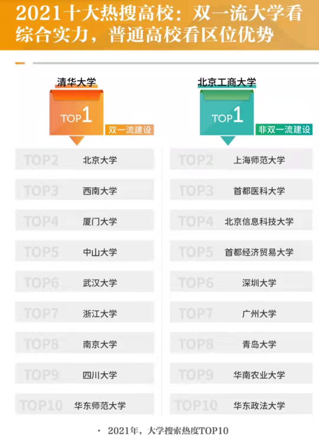 數(shù)據(jù)進(jìn)一步匯總了2021年十大熱搜高校,結(jié)果顯示,清華大學(xué)和北京大學(xué)繼續(xù)位列“雙一流”建設(shè)高校中的熱度前二。