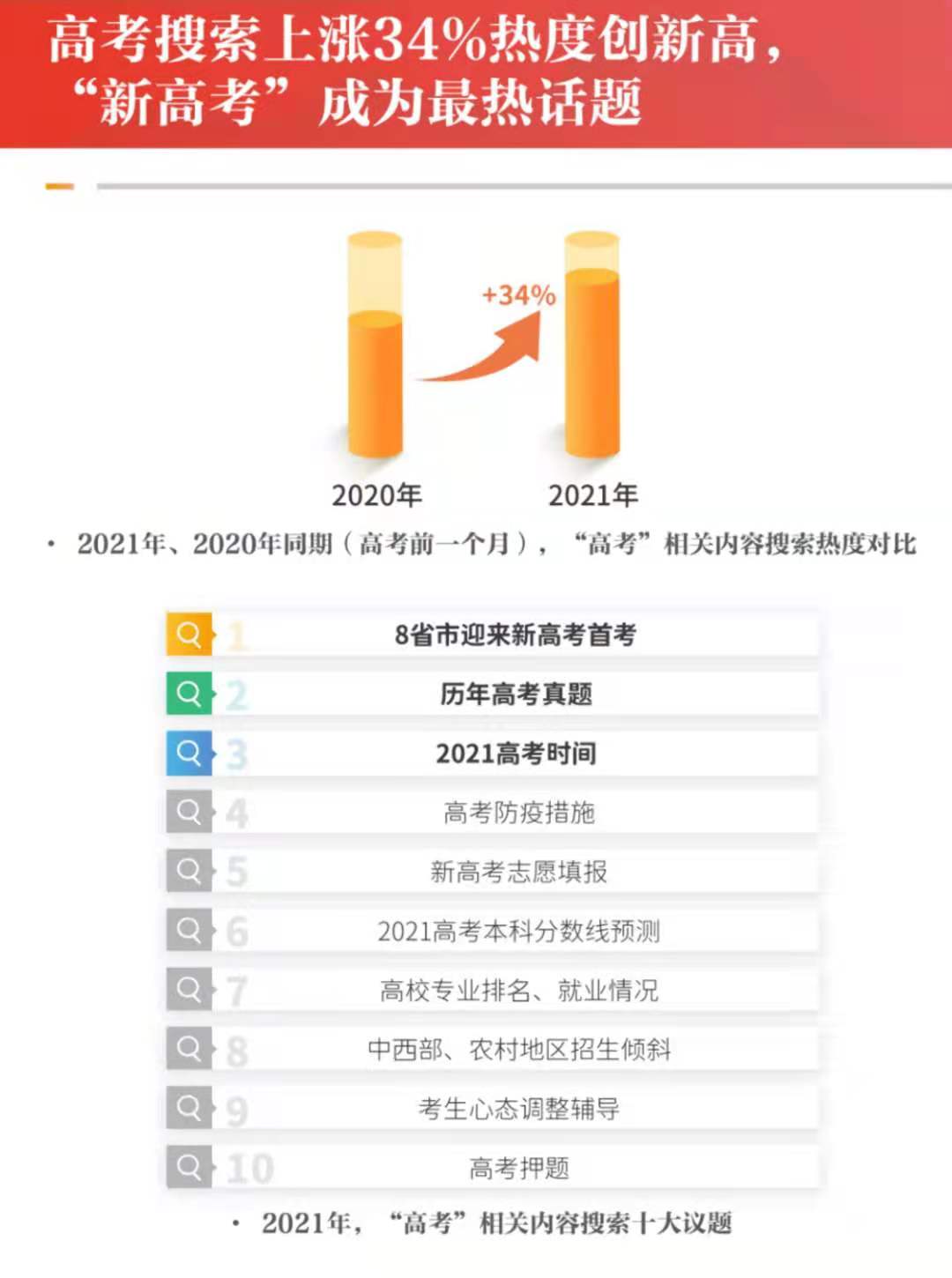 5月25日,百度聯(lián)合中國(guó)教育在線(xiàn)共同發(fā)布《2021高考搜索大數(shù)據(jù)》。數(shù)據(jù)顯示:“新高考”是今年高考最熱議題,人工智能蟬聯(lián)熱度上升最快專(zhuān)業(yè),清華登頂雙一流高校熱榜,學(xué)校排名、城市發(fā)展與平均薪酬是考生最關(guān)注的前三指標(biāo),考前解壓方法被考生家長(zhǎng)熱搜,聚會(huì)、旅游與表白是學(xué)子考后最想做的事情。