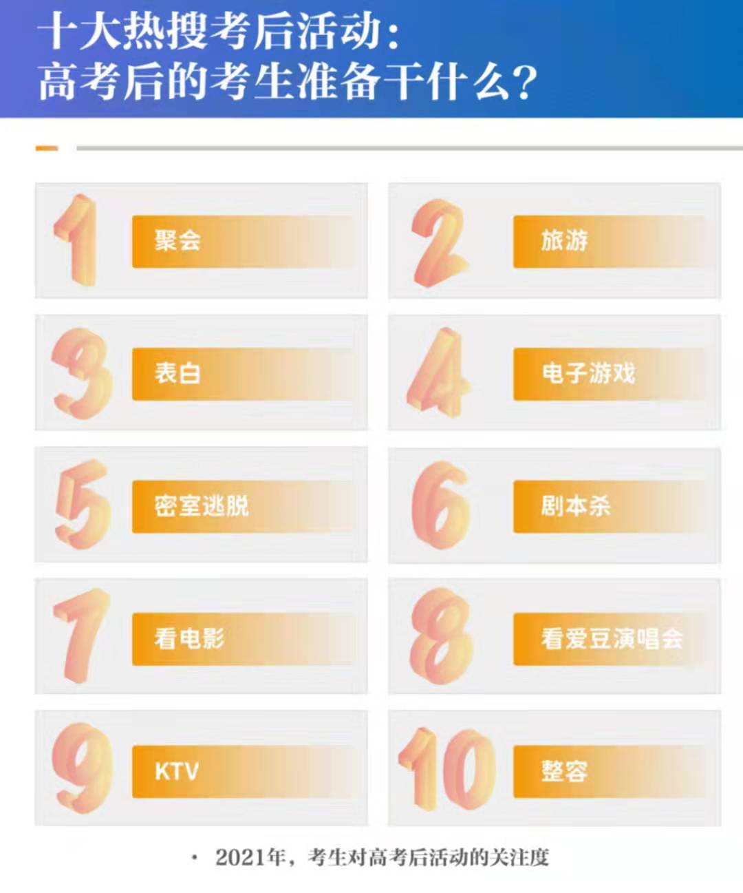 有的考生沉浸在緊張和高壓的復(fù)習(xí)狀態(tài)中,還有一部分考生已經(jīng)在暢想考后的假期生活了。 搜索數(shù)據(jù)整理出今年高考十大熱搜的考后活動(dòng):聚會(huì)成為第一。同時(shí),還有旅游、表白、電子游戲...... 對(duì)考后生活的美好憧憬,在此時(shí)成為他們備考路上另一種前進(jìn)動(dòng)力。