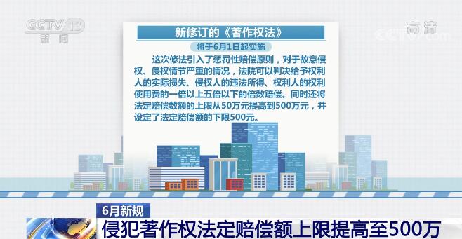 新修訂的《著作權(quán)法》將于6月1日起實施。這次修法引入了懲罰性賠償原則,對于故意侵權(quán)、侵權(quán)情節(jié)嚴重的情況,法院可以判決給予權(quán)利人的實際損失、侵權(quán)人的違法所得、權(quán)利人的權(quán)利使用費的一倍以上五倍以下的倍數(shù)賠償。同時還將法定賠償數(shù)額的上限從50萬元提高到500萬元,并設定了法定賠償額的下限500元。