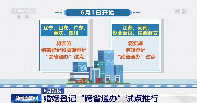 6月1日開始,遼寧、山東、廣東、重慶、四川,將實施結(jié)婚登記和離婚登記“跨省通辦”試點,而江蘇、河南、湖北武漢、陜西西安將實施結(jié)婚登記“跨省通辦”試點。