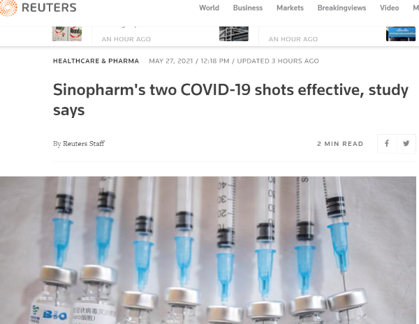 路透社報(bào)道稱,周三發(fā)表在《美國(guó)醫(yī)學(xué)會(huì)雜志》(Journal of the American Medical Association)上的一項(xiàng)同行評(píng)議研究顯示,根據(jù)中期結(jié)果,中國(guó)國(guó)藥集團(tuán)的兩種新冠疫苗的保護(hù)效力均超過70%。