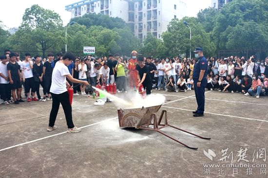 上午10時整,隨著濃煙彌漫,警報響起。師生們在消防人員的引導(dǎo)下,捂住口鼻,弓著腰,迅速撤離教學(xué)樓。演練結(jié)束后,消防人員向全校師生講解了火災(zāi)預(yù)防、火場逃生以及滅火器材的使用方法。最后,在消防人員的指導(dǎo)下,學(xué)生們親身體驗了油盆滅火演練。