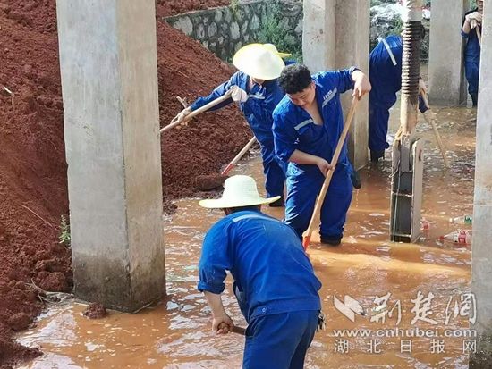 黃石新興管業(yè)職工在泥水里清理閘口垃圾。通訊員 供圖