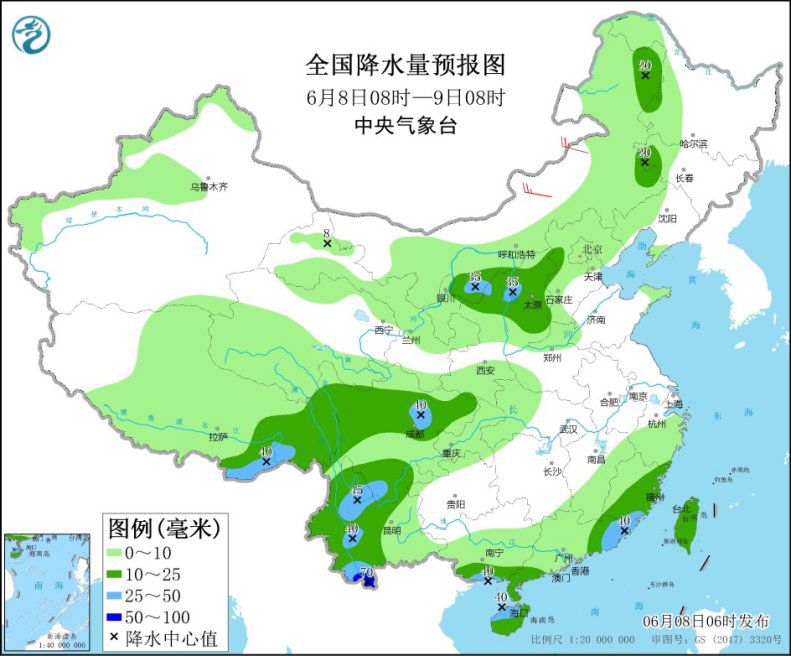 預(yù)計(jì)6月8日08時(shí)至9日08時(shí),內(nèi)蒙古東北部、陜西北部、山西中部、云南中西部和東南部、廣西南部、海南北部等地的部分地區(qū)將有短時(shí)強(qiáng)降水天氣,小時(shí)雨量20~40毫米,局地可達(dá)50毫米以上;另外,內(nèi)蒙古東北部、山西南部等地的局地將有雷暴大風(fēng)或冰雹天氣。