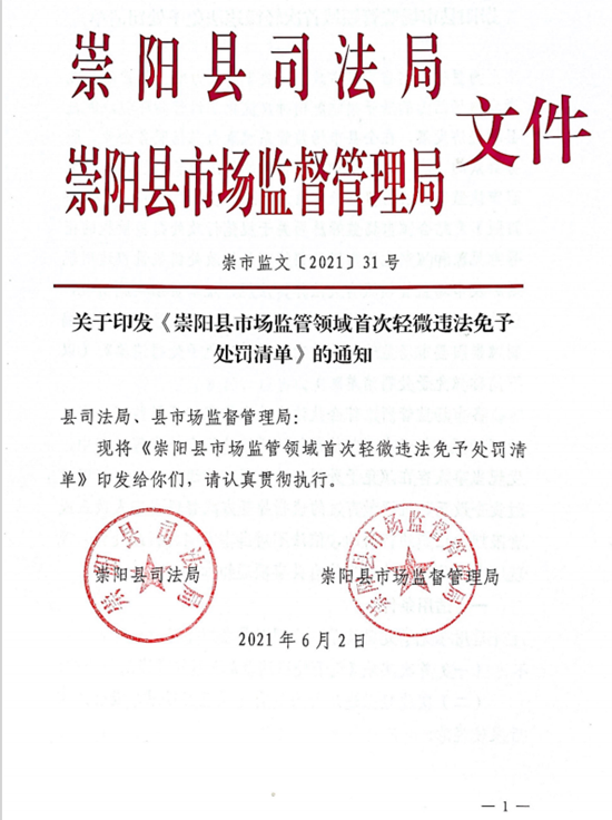 6月2日,崇陽(yáng)縣司法局、縣市場(chǎng)監(jiān)管局在廣泛征求意見(jiàn)的基礎(chǔ)上,印發(fā)了《崇陽(yáng)縣市場(chǎng)監(jiān)管領(lǐng)域首次輕微違法免予處罰清單》(2021年版)。